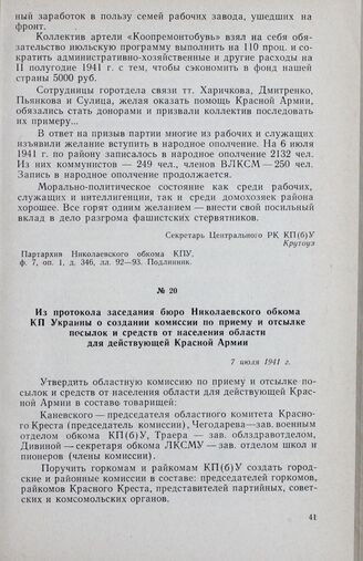 Из протокола заседания бюро Николаевского обкома КП Украины о создании комиссии по приему и отсылке посылок и средств от населения области для действующей Красной Армии. 7 июля 1941 г. // Партархив Николаевского обкома КПУ, ф. 7, oп. 1, д. 332, л. 108. Подлинник.