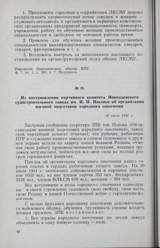 Из постановления партийного комитета Николаевского судостроительного завода им. И. И. Носенко об организации военной подготовки народного ополчения. 10 июля 1941 г.