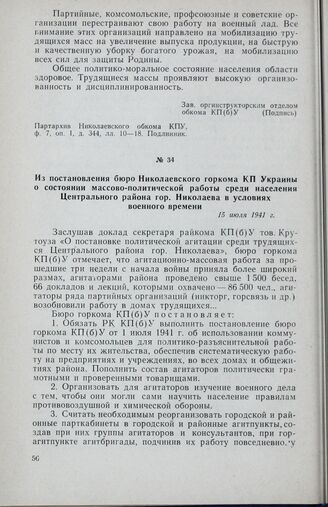 Из постановления бюро Николаевского горкома КП Украины о состоянии массово-политической работы среди населения Центрального района гор. Николаева в условиях военного времени. 15 июля 1941 г. // Партархив Николаевского обкома КПУ, ф. 7, oп. 1, д. 348, лл. 61—62. Подлинник.