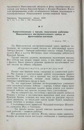 Корреспонденция о письме, полученном рабочими Николаевского инструментального завода от фронтовиков-земляков. 8 августа 1941 г.