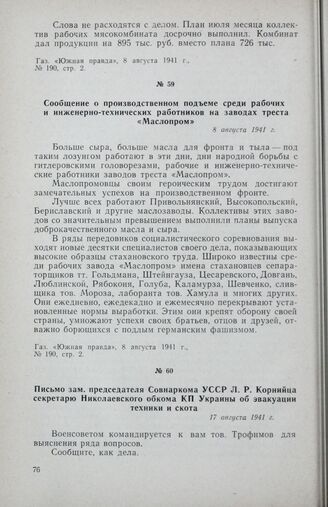 Сообщение о производственном подъеме среди рабочих и инженерно-технических работников на заводах треста «Маслопром». 8 августа 1941 г. // Газ. «Южная правда», 8 августа 1941 г., № 190, стр. 2.