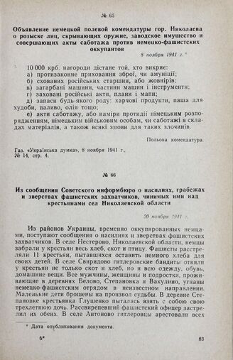 Из сообщения Советского информбюро о насилиях, грабежах и зверствах фашистских захватчиков, чинимых ими над крестьянами сел Николаевской области. 20 ноября 1941 г. // Сб. «Сообщения Советского информбюро», т. 1, стр. 364.