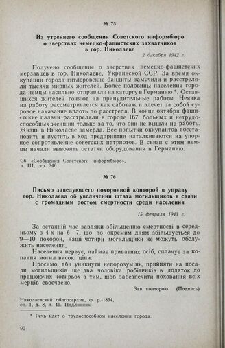 Из утреннего сообщения Советского информбюро о зверствах немецко-фашистских захватчиков в гор. Николаеве. 2 декабря 1942 г. // Сб. «Сообщения Советского информбюро», т. III, стр. 346.