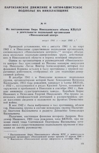 Из постановления бюро Николаевского обкома КП(б)У о деятельности подпольной организации «Николаевский центр». Август 1941 г. — март 1943 г. // Партархив Николаевского обкома КПУ, ф. 7, оп. 89, д. 120, лл. 24—28. Подлинник.
