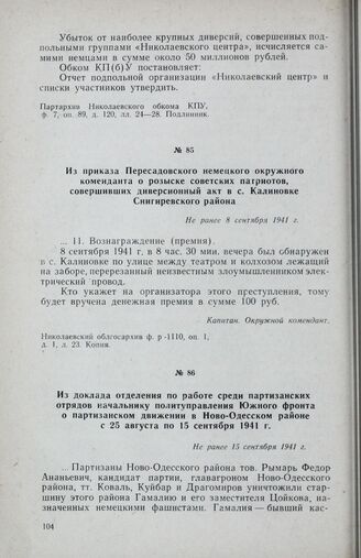 Из приказа Пересадовского немецкого окружного коменданта о розыске советских патриотов, совершивших диверсионный акт в с. Калиновке Снигиревского района. Не ранее 8 сентября 1941 г. // Николаевский облгосархив ф. р -1110, oп. 1, д. 1, л. 23. Копия.