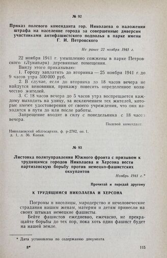 Листовка политуправления Южного фронта с призывом к трудящимся городов Николаева и Херсона вести партизанскую борьбу против немецко-фашистских оккупантов. Ноябрь 1941 г. // Партархив Института истории партии ЦК КПУ, ф. 56, oп. 1, д. 1365. Типографский экз.
