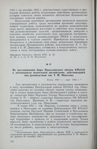 Из постановления бюро Николаевского обкома КП(б)У о деятельности подпольной организации, действовавшей под руководством тов. Т. М. Морозова. Конец 1941 г. — март 1944 г. // Партархив Николаевского обкома КПУ, ф. 7, оп. 89, д. 120, лл. 38—40. Подлинник.