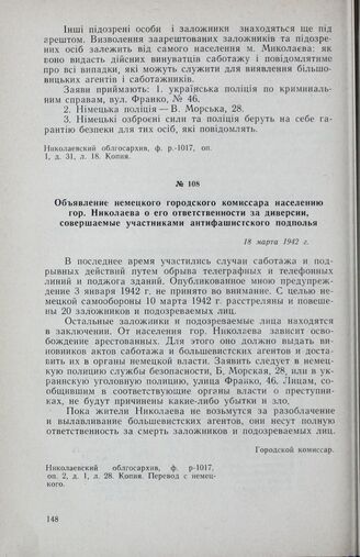 Объявление немецкого городского комиссара населению гор. Николаева о его ответственности за диверсии, совершаемые участниками антифашистского подполья. 18 марта 1942 г. // Николаевский облгосархив, ф. р-1017, оп. 2, д. 1, л. 28. Копия. Перевод с немецкого.
