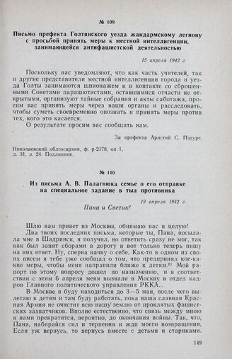 Письмо префекта Голтянского уезда жандармскому легиону с просьбой принять меры к местной интеллигенции, занимающейся антифашистской деятельностью. 15 апреля 1942 г. // Николаевский облгосархив, ф. р-2178, oп. 1, д. 31, л. 24. Подлинник.