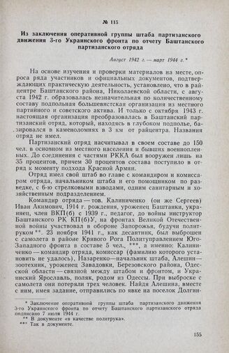 Из заключения оперативной группы штаба партизанского движения 3-го Украинского фронта по отчету Баштанского партизанского отряда. Август 1942 г. — март 1944 г. // Партархив Института истории партии ЦК КПУ, ф. 62, оп. 2, д. 396, лл. 17—24. Подлинник.