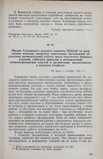 Письмо Голтянского уездного комитета КП(б)У ко всем членам сельских комитетов подпольных организаций об усилении воспитательной работы среди участников подполья, усилении саботажа приказов и распоряжений немецко-румынских властей и организации вредительства в сельском хозяйстве. Не ранее 1 октября 1943 г. // Партархив Одесского обкома КПУ, ф. 11, оп. 45, д. 1, л. 131. Копия.
