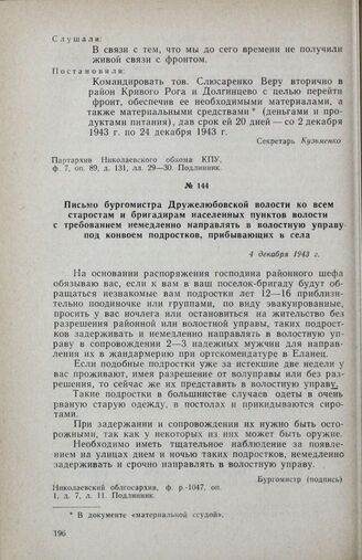 Письмо бургомистра Дружелюбовской волости ко всем старостам и бригадирам населенных пунктов волости требованием немедленно направлять в волостную управу под конвоем подростков, прибывающих в села. 4 декабря 1943 г. // Николаевский облгосархив, ф. р.-1047, оп. 1, д. 7, л. 11. Подлинник.