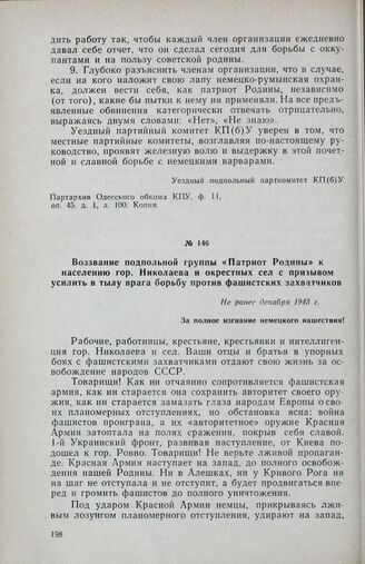 Воззвание подпольной группы «Патриот Родины» к населению гор. Николаева и окрестных сел с призывом усилить в тылу врага борьбу против фашистских захватчиков. Не ранее декабря 1943 г. // Партархив Николаевского обкома КПУ, ф. 7, оп. 89, д. 121, л. 140. Копия.