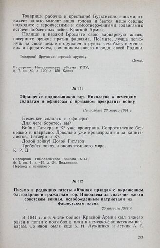 Письмо в редакцию газеты «Южная правда» с выражением благодарности гражданам гор. Николаева за спасение жизни советским воинам, освобожденным патриотами из фашистского плена. 25 августа 1944 г. // Газ. «Южная правда», 25 августа 1944 г., № 83, стр. 2.