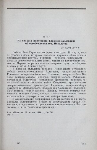 Из приказа Верховного Главнокомандования об освобождении гор. Николаева. 28 марта 1944 г.