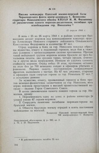 Письмо командира Одесской военно-морской базы Черноморского флота контр-адмирала С. Белоусова секретарю Николаевского обкома КП(б)У И. М. Филиппову об увековечении памяти моряков-десантников, погибших при освобождении гор. Николаева. 12 апреля 194...