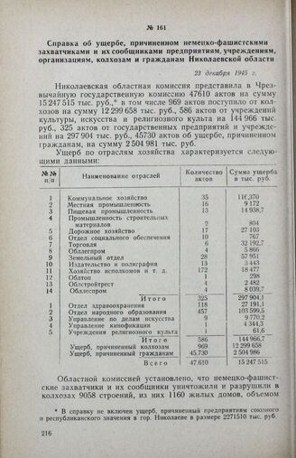 Справка об ущербе, причиненном немецко-фашистскими захватчиками и их сообщниками предприятиям, учреждениям, организациям, колхозам и гражданам Николаевской области. 23 декабря 1945 г.