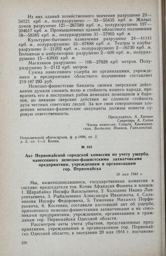 Акт Первомайской городской комиссии по учету ущерба, нанесенного немецко-фашистскими захватчиками предприятиям, учреждениям и организациям гор. Первомайска. 20 мая 1944 г.