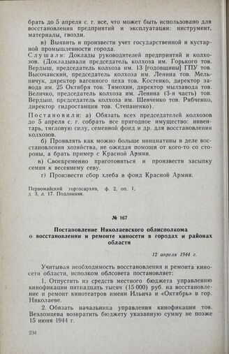 Постановление Николаевского облисполкома о восстановлении и ремонте киносети в городах и районах области. 12 апреля 1944 г.