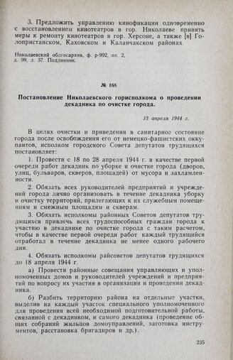 Постановление Николаевского горисполкома о проведении декадника по очистке города. 13 апреля 1944 г. // Николаевский облгосархив, ф. р-992, оп. 2, д. 39, л. 12. Копия.
