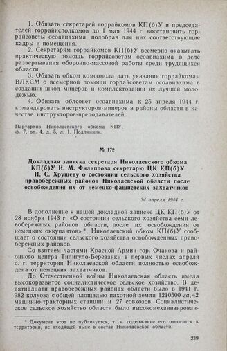 Докладная записка секретаря Николаевского обкома КП(б)У И. М. Филиппова секретарю ЦК КП(б)У Н. С. Хрущеву о состоянии сельского хозяйства правобережных районов Николаевской области после освобождения их от немецко-фашистских захватчиков. 24 апреля...