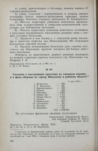 Сведения о поступивших средствах на танковую колонну и в фонд обороны по городу Николаеву и районам области. 9 мая 1944 г. // Партархив Николаевского обкома КПУ, ф. 7, оп. 85, д. 17, л. 30. Подлинник.
