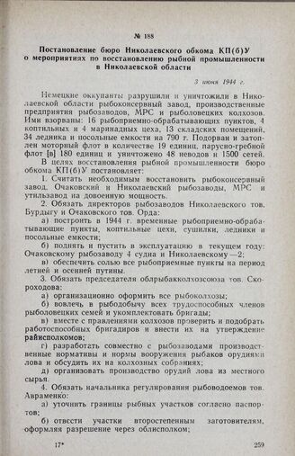 Постановление бюро Николаевского обкома КП(б)У о мероприятиях по восстановлению рыбной промышленности в Николаевской области. 3 июня 1944 г.