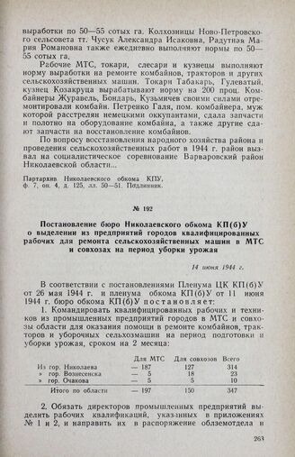 Постановление бюро Николаевского обкома КП(б)У о выделении из предприятий городов квалифицированных рабочих для ремонта сельскохозяйственных машин в МТС и совхозах на период уборки урожая. 14 июня 1944 г.