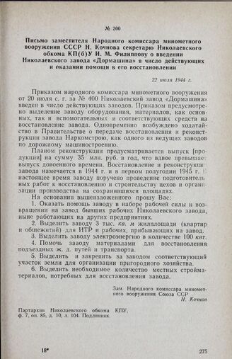 Письмо заместителя Народного комиссара минометного вооружения СССР Н. Кочнова секретарю Николаевского обкома КП(б)У И. М. Филиппову о введении Николаевского завода «Дормашина» в число действующих и оказании помощи в его восстановлении. 22 июля 1944 г. // Партархив Николаевского обкома КПУ, ф. 7, оп. 85, д. 10, л. 104. Подлинник.