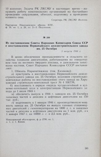 Из постановления Совета Народных Комиссаров Союза ССР о восстановлении Первомайского дизелестроительного завода им. 25 Октября. 5 августа 1944 г. // Николаевский облгосархив, ф. р-2790, oп. 1, д. 1, л. 1. Копия.