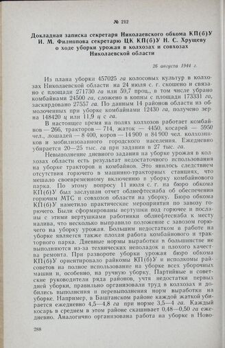 Докладная записка секретаря Николаевского обкома КП(б)У И. М. Филиппова секретарю ЦК КП(б)У Н. С. Хрущеву о ходе уборки урожая в колхозах и совхозах Николаевской области. 26 августа 1944 г.