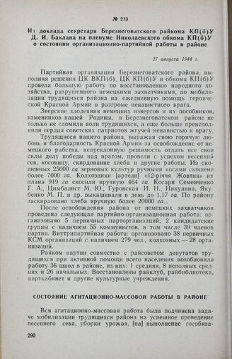 Из доклада секретаря Березнеговатского райкома КП(б)У Д. И. Баклана на пленуме Николаевского обкома КП(б)У о состоянии организационно-партийной работы в районе. 27 августа 1944 г. // Партархив Николаевского обкома КПУ, ф. 7, оп. 4, д. 129, лл. 48—49. Подлинник.