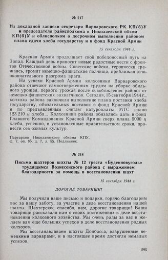 Письмо шахтеров шахты № 12 треста «Буденновуголь» трудящимся Вознесенского района с выражением благодарности за помощь в восстановлении шахт. 15 сентября 1944 г.
