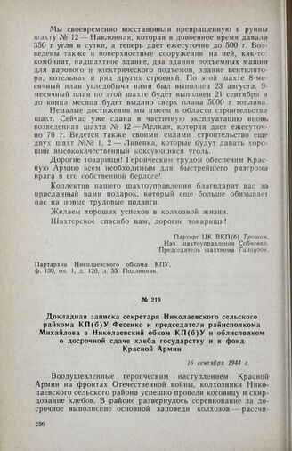 Докладная записка секретаря Николаевского сельского райкома КП(б)У Фесенко и председателя райисполкома Михайлова в Николаевский обком КП(б)У и облисполком о досрочной сдаче хлеба государству и в фонд Красной Армии. 16 сентября 1944 г. // Партархив Николаевского обкома КПУ, ф. 7, оп. 85, д. 7, л. 124. Подлинник.