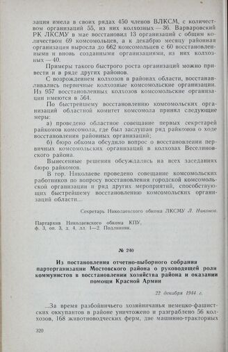 Из постановления отчетно-выборного собрания парторганизации Мостовского района о руководящей роли коммунистов в восстановлении хозяйства района и оказании помощи Красной Армии. 22 декабря 1944 г. // Партархив Николаевского обкома КПУ, ф. 2246, оп. 11, д. 1, лл. 87—88. Подлинник.