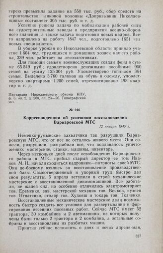 Корреспонденция об успешном восстановлении Варваровской МТС. 12 января 1945 г.