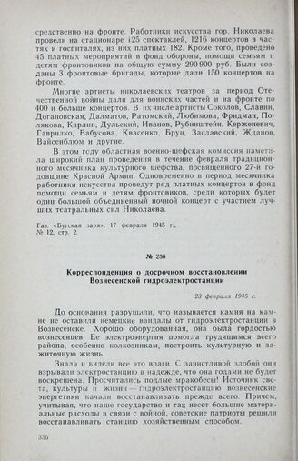 Корреспонденция о досрочном восстановлении Вознесенской гидроэлектростанции. 23 февраля 1945 г.