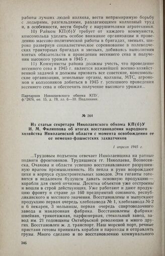 Из статьи секретаря Николаевского обкома КП(б)У И. М. Филиппова об итогах восстановления народного хозяйства Николаевской области с момента освобождения ее от немецко-фашистских захватчиков. 1 апреля 1945 г.