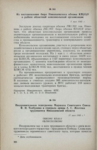 Поздравительная телеграмма Маршала Советского Союза Ф. И. Толбухина и генерала армии А. С. Желтова трудящимся Николаевской области. 17 мая 1945 г. // Газ. «Бугская заря», 17 мая 1945 г., № 72, стр. 1.