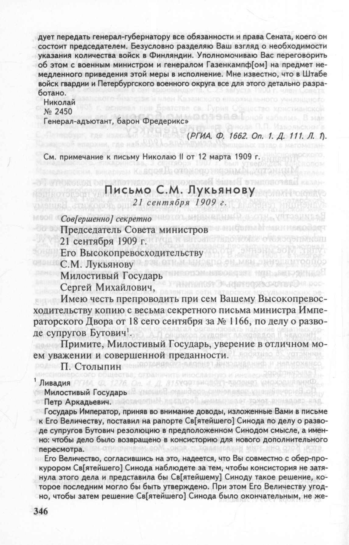 Письмо барона В.Б. Фредерикса А.А. Столыпину, 18 сентября 1909 г. // Опубл.: Былое. — 1926. — № 2 (36). — Л., 1991. — С. 86.