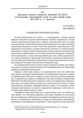Докладная записка в комиссию Политбюро ЦК ВКП(б) от начальника Следственной части по особо важным делам МГБ СССР А. Г. Леонова. 7 июля 1951 г. // АП РФ. Ф. 3. Оп. 58. Д. 537. Л. 69–73. Подлинник. Машинопись.