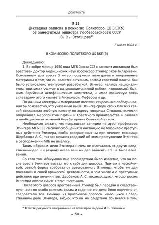 Докладная записка в комиссию Политбюро ЦК ВКП(б) от заместителя министра госбезопасности СССР С. И. Огольцова. 7 июля 1951 г. // АП РФ. Ф. 3. Оп. 58. Д. 537. Л. 87–95. Подлинник. Машинопись.