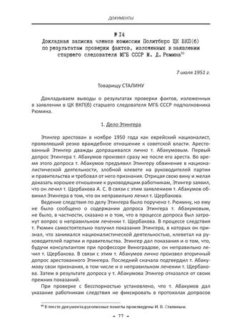 Докладная записка членов комиссии Политбюро ЦК ВКП(б) по результатам проверки фактов, изложенных в заявлении старшего следователя МГБ СССР М. Д. Рюмина. 7 июля 1951 г. // АП РФ. Ф. 3. Оп. 58. Д. 537. Л. 63, 64, 65. Подлинник. Машинопись. Л. 63 (об),64 (об), 65 (об)–68 (об). Подлинник. Рукопись.