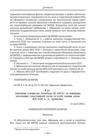 Заявление в комиссию Политбюро ЦК ВКП(б) от помощника начальника следственной части по особо важным делам МГБ СССР А. В. Путинцева. 11 июля 1951 г.