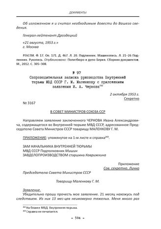 Сопроводительная записка руководства Внутренней тюрьмы МВД СССР Г. М. Маленкову с приложением заявления И. А. Чернова. 2 октября 1953 г.