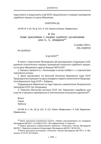 Новые предложения о порядке судебного рассмотрения дела В. С. Абакумова. 6 ноября 1954 г. // АП РФ. Ф. 3. Оп. 58. Д. 225. Л. 127. Копия. Машинопись. Л. 128. Подлинник.Машинопись.