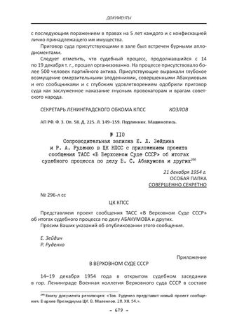 Сопроводительная записка Е. Л. Зейдина и Р. А. Руденко в ЦК КПСС с приложением проекта сообщения ТАСС «В Верховном Суде СССР» об итогах судебного процесса по делу В. С. Абакумова и других. 21 декабря 1954 г. // АП РФ. Ф. 3. Оп. 58. Д. 225. Л. 160–167. Подлинник. Машинопись.