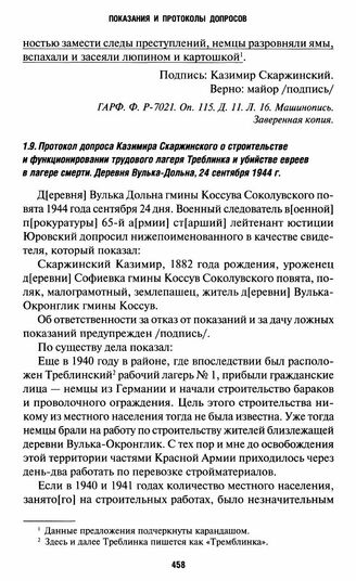 Протокол допроса Казимира Скаржинского о строительстве и функционировании трудового лагеря Треблинка и убийстве евреев в лагере смерти. Деревня Вулька-Дольна, 24 сентября 1944 г.