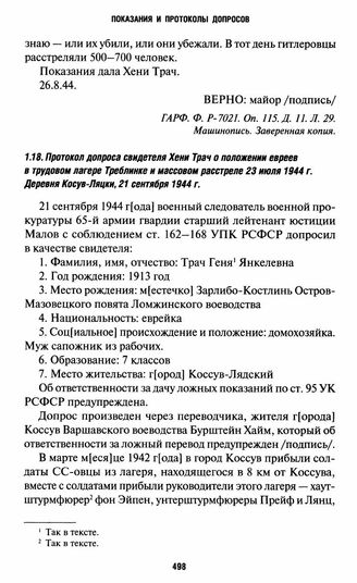 Протокол допроса свидетеля Хени Трач о положении евреев в трудовом лагере Треблинке и массовом расстреле 23 июля 1944 г. Деревня Косув-Ляцки, 21 сентября 1944 г.