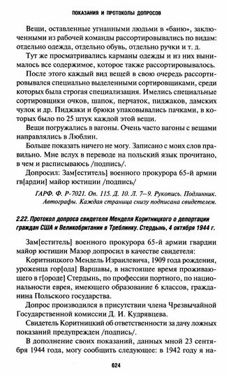 Протокол допроса свидетеля Менделя Коритницкого о депортации граждан США и Великобритании в Треблинку. Стердынь, 4 октября 1944 г.